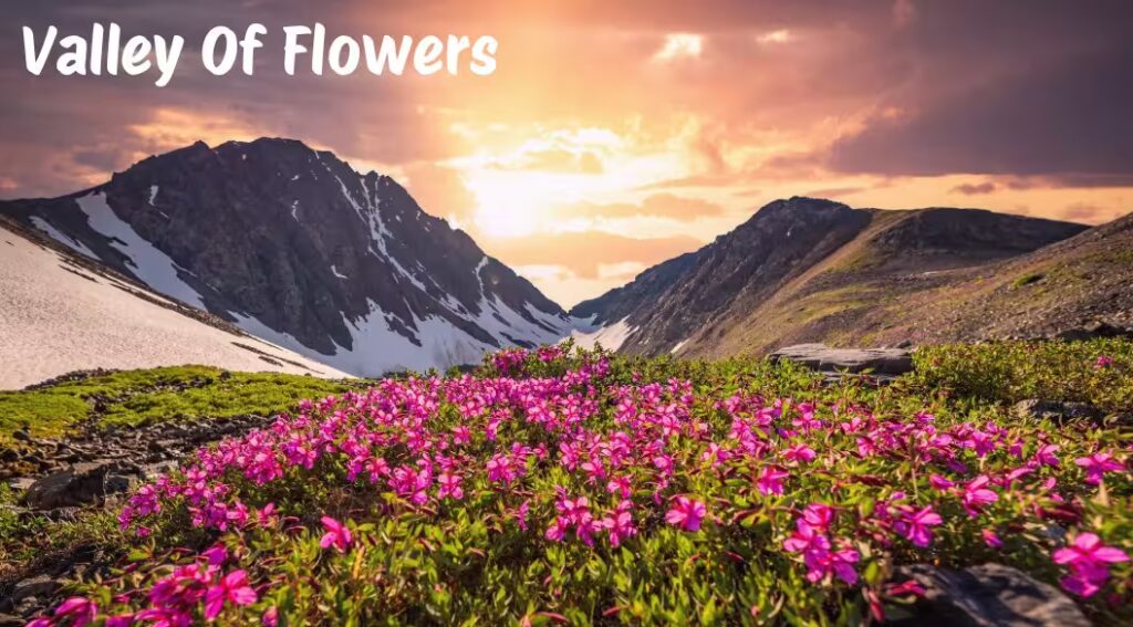 Valley of Flowers in Uttarakhand, decorated with colorful flowers blooming in the rainy season, surrounded by the snow-covered Himalayan hills all around.
